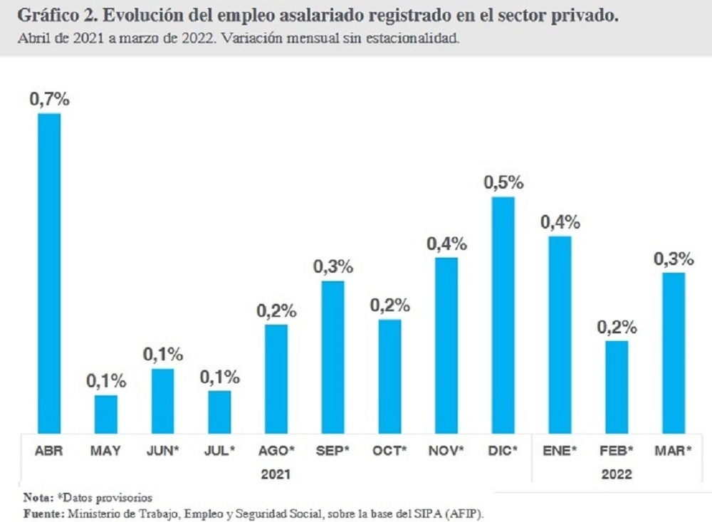 La información procesada por el Ministerio de Trabajo, a partir de la estadística del Sistema Integrado Previsional Argentino (SIPA), dio cuenta de que en marzo continuó la expansión del empleo asalariado registrado del sector privado, sumó 21.000 trabajadores en el mes, en la serie ajustada por estacionalidad.