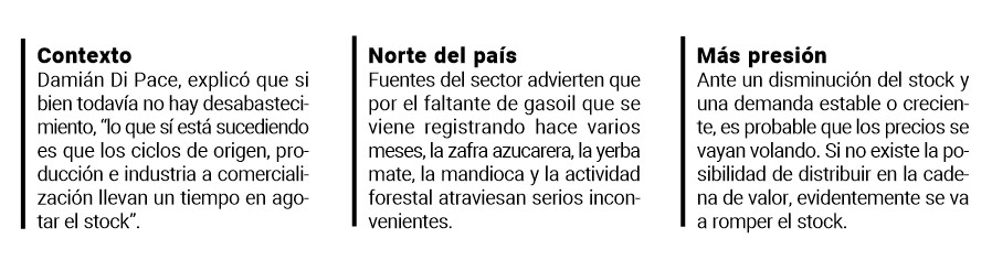 El faltante de gasoil golpea al campo y a todos los sectores productivos del país. El problema se arrastra desde marzo y aún no se pudo o supo solucionar, poniendo en serios inconvenientes logística, labores culturales, siembra y cosecha de las diferentes producciones de país, dando lugar a posibles problemas de desabastecimiento, agotamiento de stocks y consecuente alza de precios de los alimentos, que sumaría más presión a la inflación.