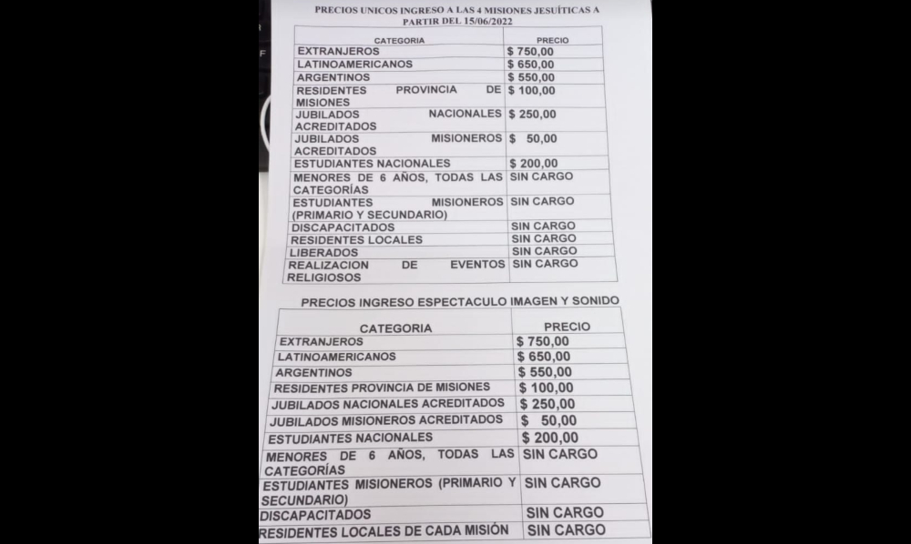 Por otra parte, para presenciar el espectáculo de imagen y sonido, los valores comienzan en $750 para extranjeros, latinoamericanos $650, argentinos $550, misioneros $100, jubilados (nacionales $250 y misioneros $50), estudiantes nacionales $200. Los demás entran sin cargo.