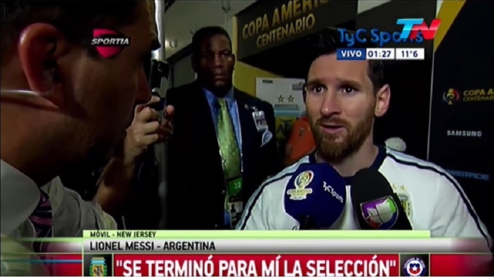 En 2016 a pocas horas de una nueva caída en la final de la Copa América, un Messi abatido y harto de soportar la carga enfrentó los micrófonos para anunciar su retiro de la selección.