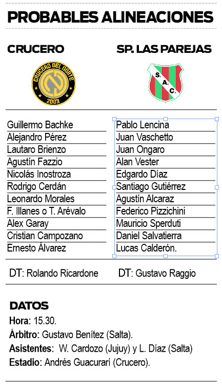 El probable once que pondrá Crucero será: Guillermo Bachke; Alejandro Pérez, Lautaro Brienzo, Agustín Fazzio y Nicolás Inostroza; Rodrigo Cerdán, Leonardo Morales, Fabricio Illanes o Thobías Arévalo y Alex Garay; Cristian Campozano y Ernesto Álvarez.