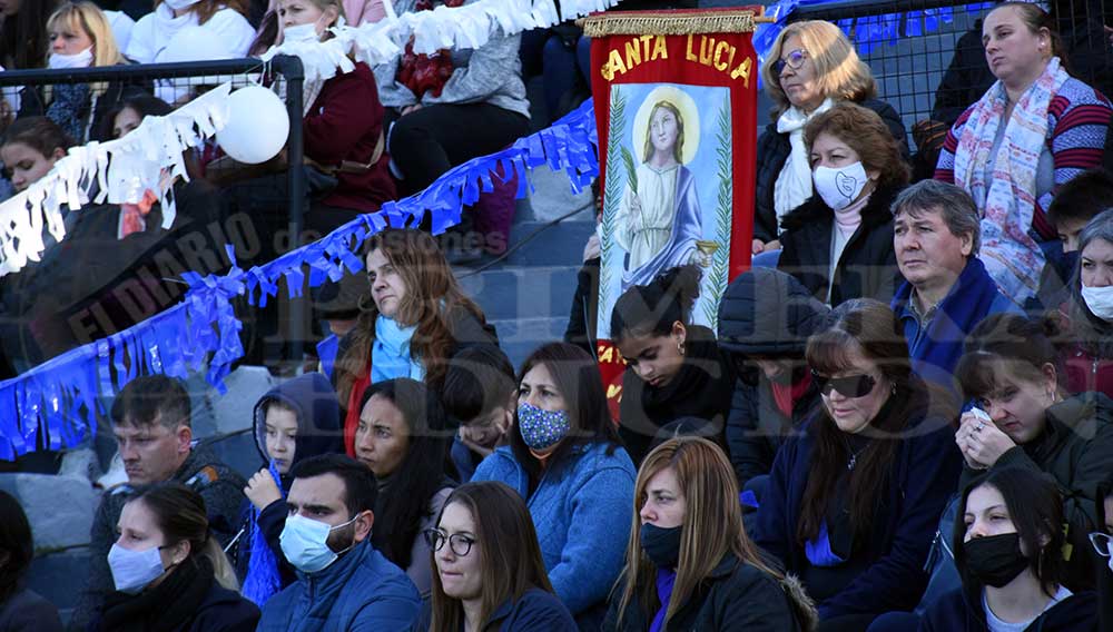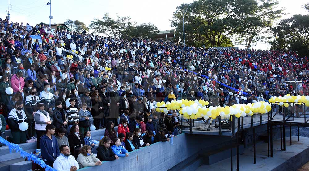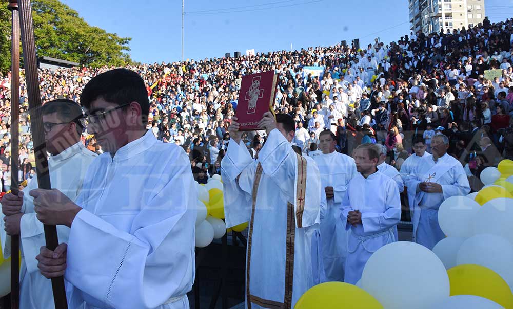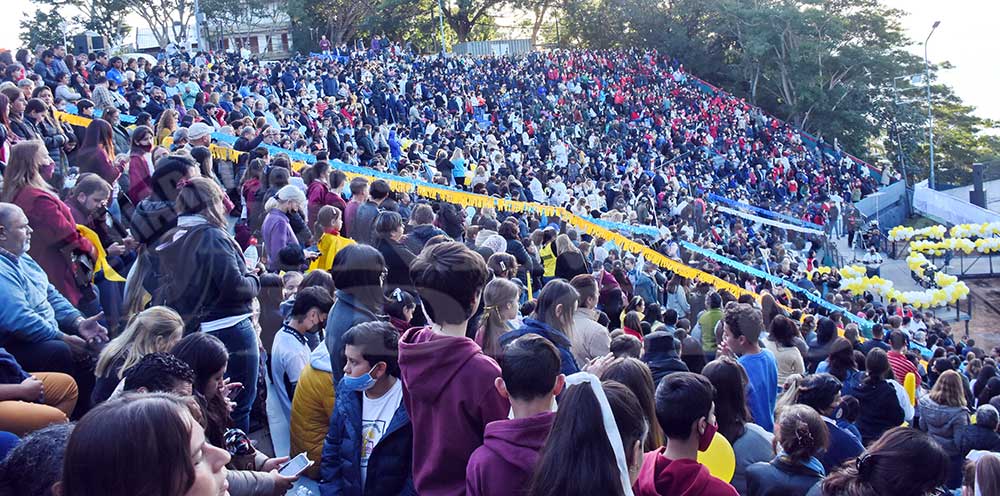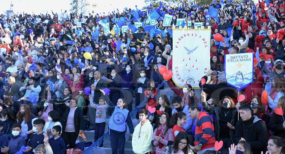 Desde cerca de las 14, en un día a pleno sol y fresco, los grupos de niños y jóvenes, junto a sus familiares, empezaron a ocupar las gradas del Anfiteatro, acompañados por docentes de distintas escuelas católicas y también los catequistas de las parroquias, luciendo cada grupo un color diferente que previamente había sido definido.