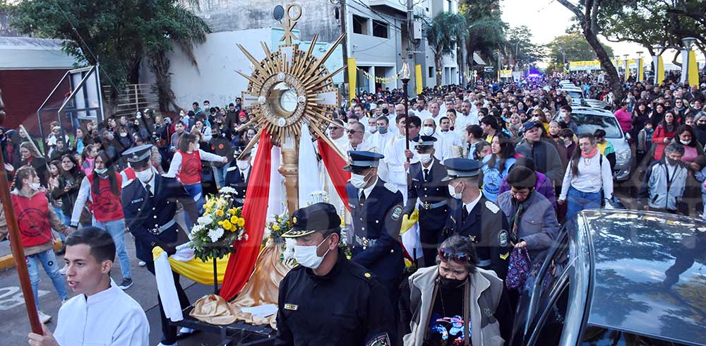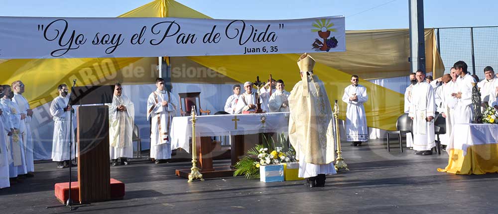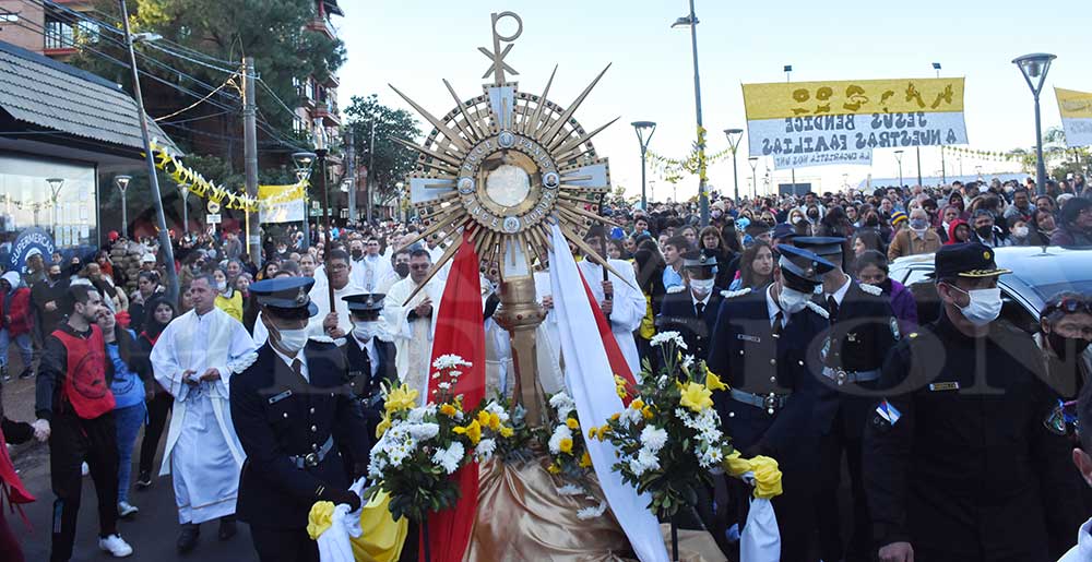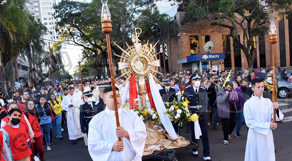 Bajo el lema “Yo soy el Pan de Vida”, los representantes de las diferentes parroquias de la capital provincial y de Garupá vivieron una jornada inolvidable de Corpus Christi, que volvió a realizarse de manera masiva tras las restricciones de las dos últimas ediciones por la pandemia de COVID-19.