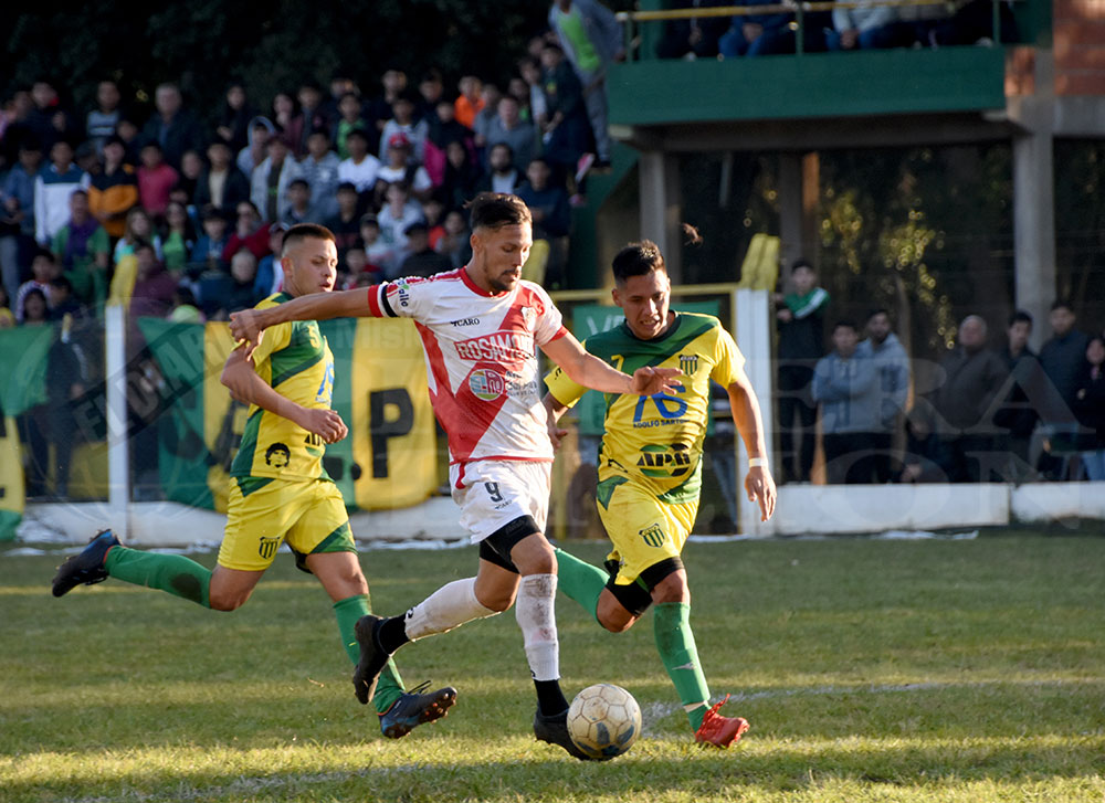 PRIMER PASO. Gastón Caruso se la lleva ante la marca de Exequiel Urunaga. El delantero marcó el único gol para la victoria de La Franja.