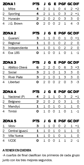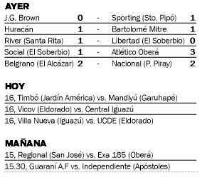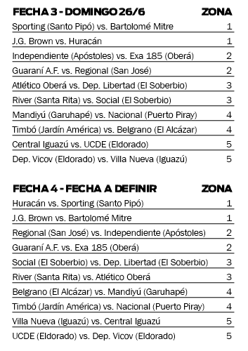 Además, en El Soberbio, Atlético Oberá se hizo fuerte ante el local Social y se impuso por 3-1 para cortarse en lo más alto de la Zona 3; mientras que en el mismo grupo, pero en Santa Rita, River Plate aprovechó su localía y superó por 1-0 a Libertad de El Soberbio.