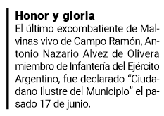 A partir del trabajo de la Junta de Estudios Históricos de esta localidad, el miembro de Infantería del Ejército Argentino en la Guerra de Malvinas, Antonio Nazario Alvez de Olivera, fue declarado “Ciudadano Ilustre del Municipio”.