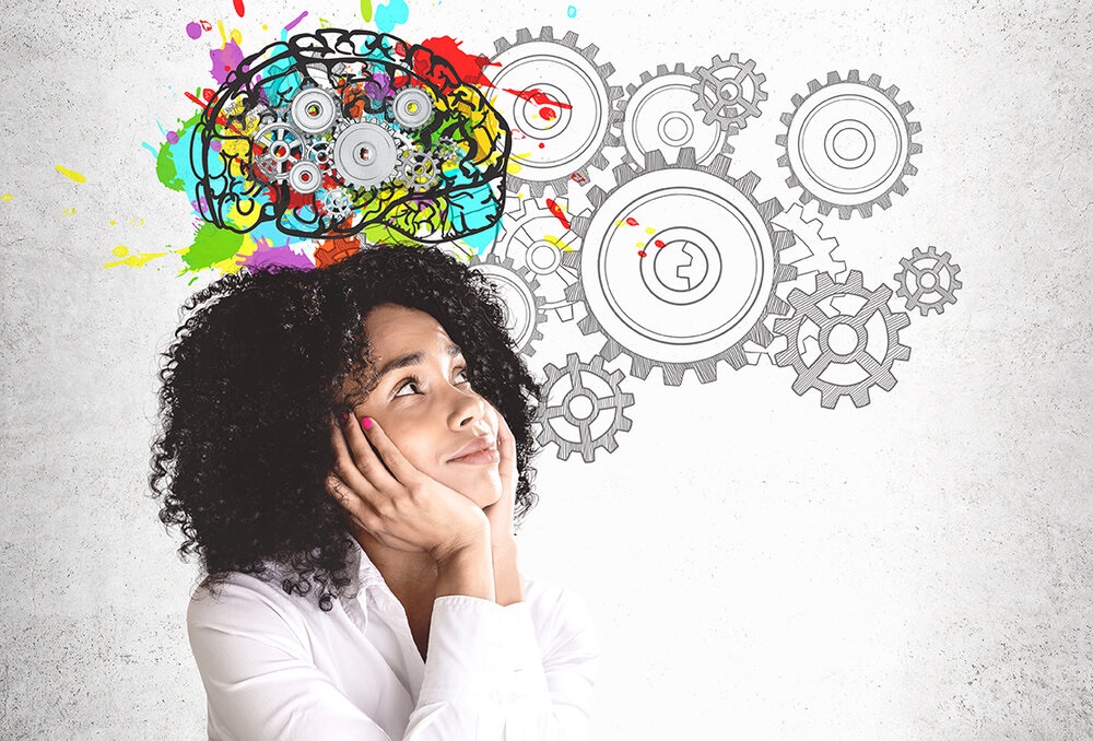 Smiling young African American woman in white shirt looking at colorful brain sketch with gears drawn on concrete wall. Concept of brainstorming