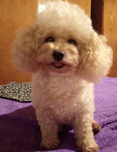 Para sus mascotas no piensa “en un nombre específico, el que se me venía a la cabeza le asignaba. Moli se llama por la protagonista de Ghost. Ella fue la primera en llegar, es una caniche micro toy, tiene 7 años y medio. Súper compañera, va a todos lados conmigo, es súper sociable, también es glotona, gordita, le encanta comer, se sienta como una persona te ruega con sus patitas pidiéndote y si no tiene hambre se va y esconde la comida hasta debajo de la manta. Es celosa de la manada, es la única que duerme conmigo”.