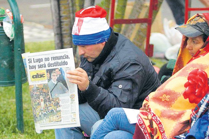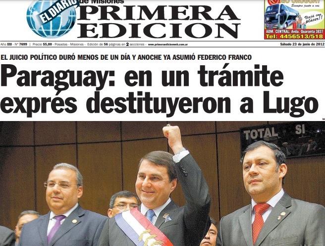 Lugo denuncia que se enfrenta a un “Golpe de Estado exprés”. Por 39 votos a favor, 4 en contra y 2 abstenciones en el Senado, el Presidente fue destituido del cargo por “mal desempeño de sus funciones”. Media hora después asumió en su lugar el vicepresidente Federico Franco.