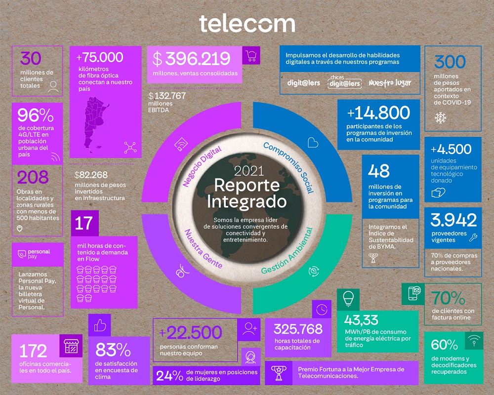 “A lo largo de 2021 continuamos acompañando las necesidades de digitalización de la sociedad. Robustecimos las redes y los servicios para ofrecer la mejor experiencia de conectividad en todo el país. Fortalecimos nuestra relación con los partners estratégicos y con la cadena de valor que constituyen parte de nuestra transformación. Acompañamos a nuestros colaboradores incorporando un nuevo modelo híbrido de trabajo, una experiencia más dinámica y colaborativa, en espacios donde prima una cultura de diversidad, equidad e inclusión. Profundizamos nuestra estrategia de inversión social ampliando los programas de inclusión digital. Publicamos nuestra política de Gestión Ambiental para oficializar los principios de cuidado ambiental, gestión de recursos y eficiencia energética en los que venimos trabajando desde hace años. Todos los días estamos buscando maneras innovadoras de lograr que nuestras operaciones sean más sustentables. Por último, mantenemos siempre firme nuestra vocación de seguir invirtiendo en el país para que los argentinos puedan mejorar su calidad de vida gracias a nuestros servicios en todo el país”, señaló Roberto Nobile, CEO de Telecom.