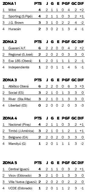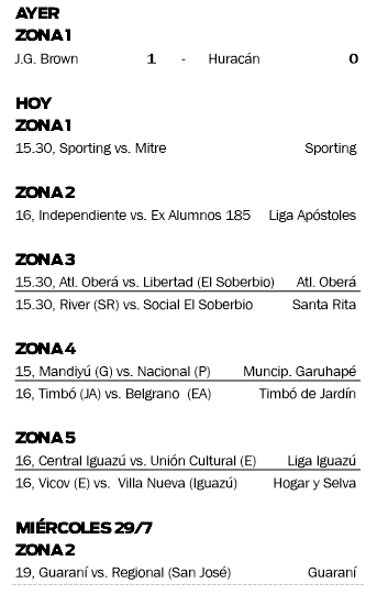 Finalmente, en la Zona 5, Central Iguazú recibirá a Unión Cultural de Eldorado y Vicov de Eldorado hará lo propio ante Villa Nueva de Iguazú. Los dos partidos serán a las 16.