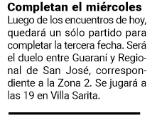 Por la Zona 2 se desarrollará un sólo juego ya que el otro (Guaraní-Regional) se completará recién el miércoles. A partir de las 16, en el estadio General Manuel Belgrano de la Liga de Apóstoles, Independiente recibirá a Ex Alumnos 185 de Oberá.