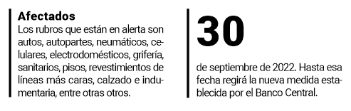 Los rubros que ya se encuentran en alerta son: autos, autopartes, neumáticos, teléfonos celulares (como el iPhone), electrodomésticos, grifería, sanitarios, pisos, revestimientos de líneas más caras, calzado e indumentaria, entre otros.