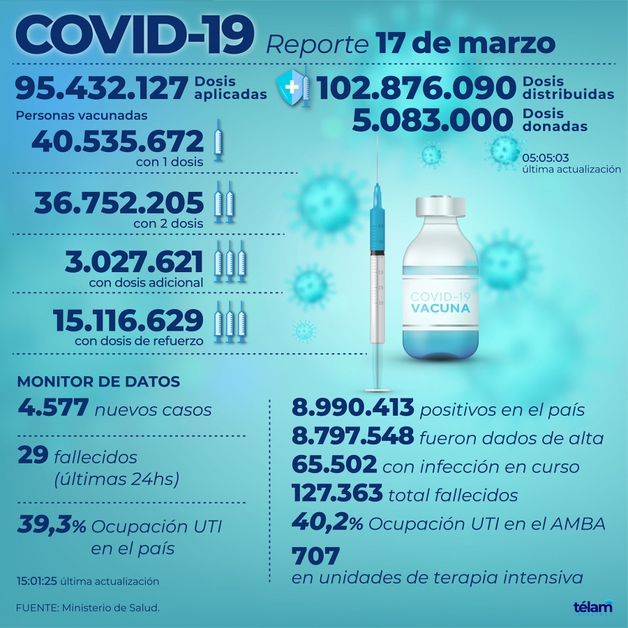 Según el Monitor Público de Vacunación, el total de dosis aplicadas asciende a 106.058.147, de los cuales 40.846.000 recibieron una dosis, 37.612.722 las dos, 3.101.453 una adicional y 24.497.972 una de refuerzo, mientras que las vacunas distribuidas a las jurisdicciones llegan a 113.188.242 y las donadas a 5.083.000.