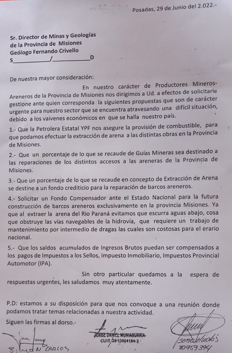 Productores mineros-areneros de Misiones enviaron una carta al Director de Minas y Geología de la provincia, Fernando Crivello, solicitando que interceda para solucionar cinco puntos que dificultan el desarrollo de sus actividades, debido a los vaivenes económicos en que se halla el país.