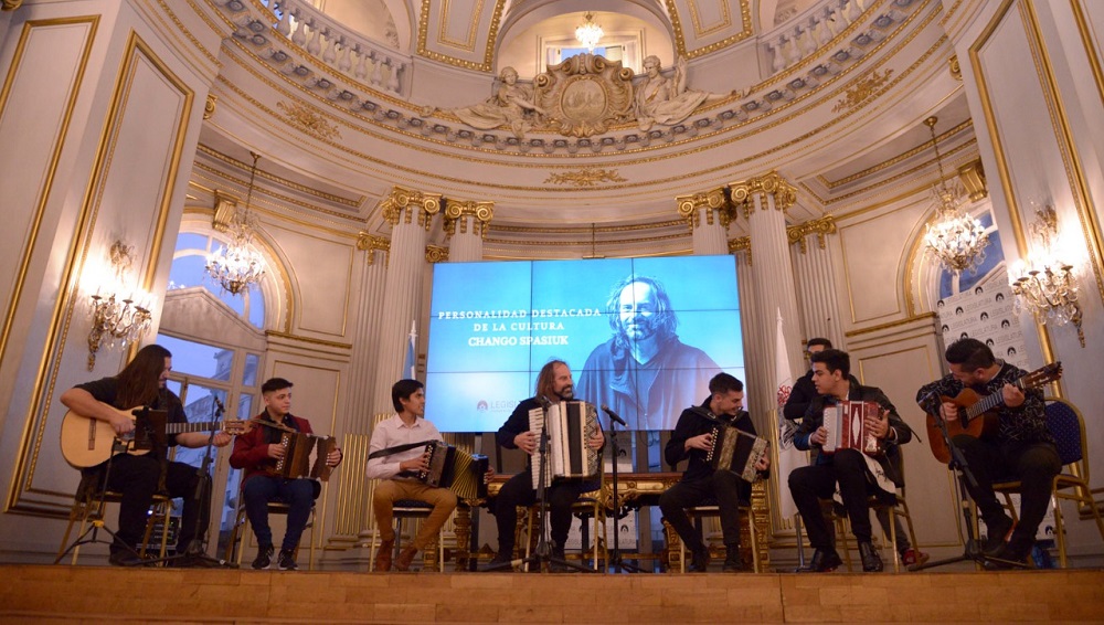 El acordeonista y compositor misionero Chango Spasiuk recibió ayer la distinción de Personalidad Destacada de la Cultura de la Ciudad de Buenos Aires en una ceremonia que se realizó en la Legislatura porteña, durante la cual interpretó algunos de sus clásicos chamamés junto a un grupo de jóvenes músicos.