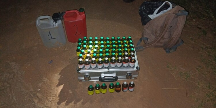Ante esta situación, los funcionarios efectuaron el registro de los elementos hallados y constataron la presencia de 64 frascos de 50 mililitros y dos bidones de 5 litros cada uno con una sustancia que al ser sometida a las pruebas de reactivos “Scott”, estas arrojaron resultado positivo para ketamina.