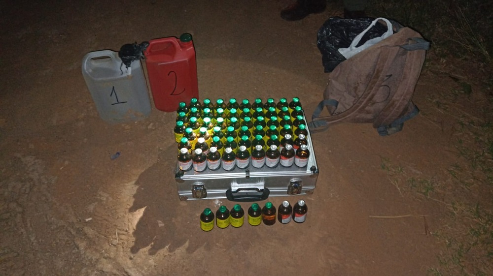Ante esta situación, los funcionarios efectuaron el registro de los elementos hallados y constataron la presencia de 64 frascos de 50 mililitros y dos bidones de 5 litros cada uno con una sustancia que al ser sometida a las pruebas de reactivos “Scott”, estas arrojaron resultado positivo para ketamina.