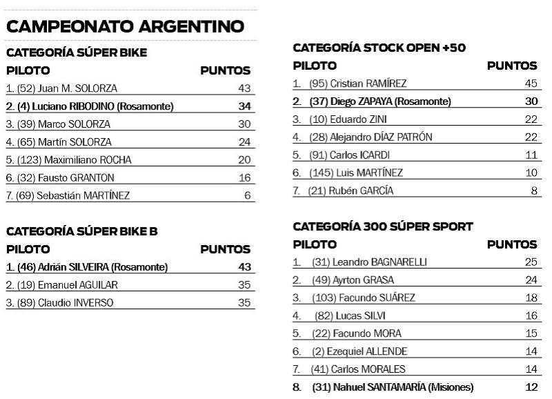 Recordemos que en la última fecha, Ribodino finalizó tercero sumando puntos importantes y quedando como escolta en el campeonato. Por su parte, Adrián Silveira terminó segundo y mantiene el liderazgo en su categoría.