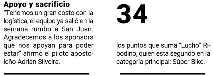 Sobre el trazado, apuntó: “Con estos cambios anduvimos competitivos, bajé el récord de la pista de Oberá en motociclismo reduciendo casi un segundo. Muy contento con el ritmo de cara a San Juan, que es un circuito nuevo para mí. Por lo que sé, y para la mayoría que corrió ahí, es muy técnico”.