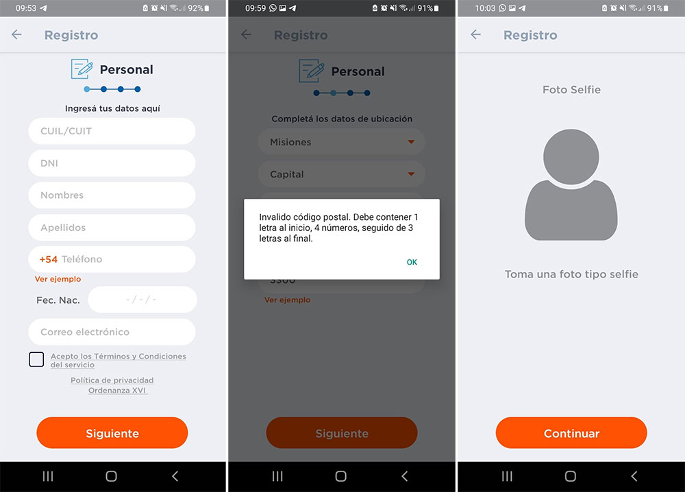 Los datos que exige la aplicación son el cuit, el número de DNI, nombres, apellidos, número de celular, fecha de nacimiento, correo electrónico, provincia, departamento, ciudad, dirección; sumado al código postal alfanumérico; es decir que no basta con poner 3300 -por ejemplo- sino que debe estar compuesto por una letra al inicio, cuatro números y tres letras al final. Además, se debe tomar una foto del DNI del frente y del dorso, y la persona se debe sacar una selfie. Una vez que se completen todos esos puntos recién la persona puede generar su contraseña.
