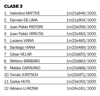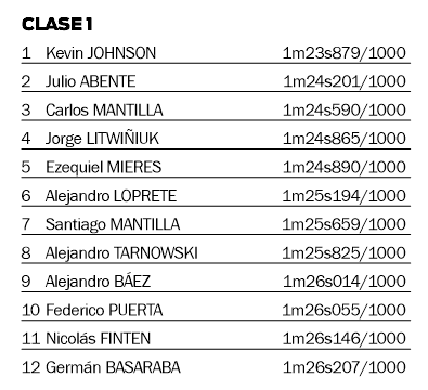 En cuanto a la Clase 1, la más numerosa, el poleman de la fecha fue Kevin Johnson, quien registró un cronómetro de 1m23s879/1000 al mando del Fiat Uno del Issler Competición. Julio Abente clasificó segundo, mientras que Carlos “El Indio” Mantilla fue tercero y el actual campeón, Litwiñiuk, cuarto.