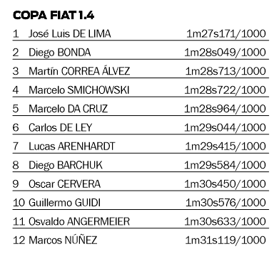 Respecto a la Copa Fiat, los tradicionales “fititos”, la pole quedó en manos de José Luis De Lima, con un tiempo de 1m27s171/1000, mientras que segundo fue Diego Bonda y tercero clasificó Martín Correa Álvez.
