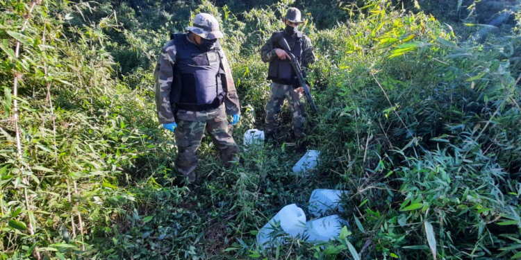 El procedimiento se dio cuando personal de la fuerza realizaba un patrullaje de prevención por la zona fronteriza, muy concurrida por los narcos. En un momento se observó a dos personas que caminaban por un angosto camino entre la maleza, con varios bultos a cuestas.