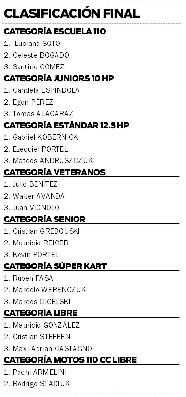 Los ganadores fueron: Luciano Soto en Escuela 110cc; Candela Espíndola se impuso en Junior 10HP; mientras que Gabriel Kobernick tuvo un gran duelo con Ezequiel Portel por la victoria en Estándar 12.5 HP.