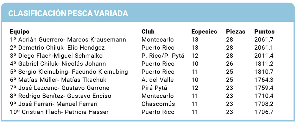 También los locales Demetrio Chiluk y Elio Hendgez tuvieron una buena remontada, ya que treparon ocho lugares y finalmente quedaron como escoltas. Y lo mismo ocurrió con los jóvenes pescadores del Club Aristóbulo del Valle, Matías Tkachuk y Matías Müller, que pasaron de la posición 20 al 6º puesto.