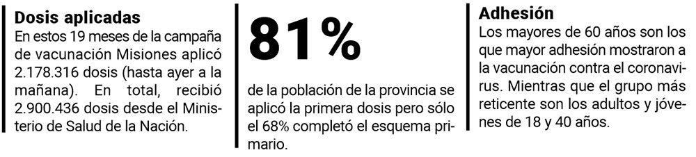 Pese a ello y al intenso trabajo de los vacunadores que aún hoy están en cada actividad, exposición y feria que se realice en la provincia, sólo el 68% de la población misionera completó el esquema primario (primera y segunda dosis) y apenas el 40% se aplicó tercera o cuarta dosis.