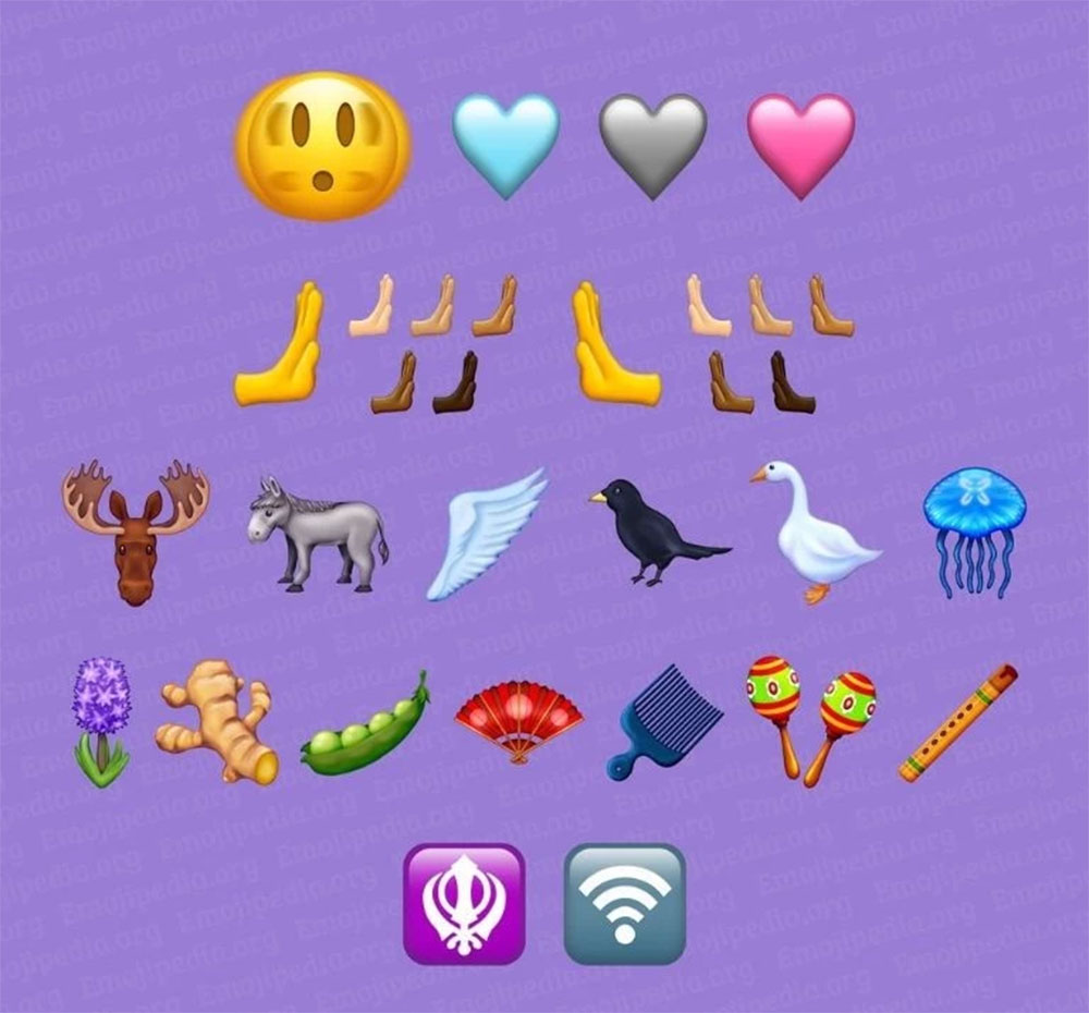 Con relación a los animales se agregarán seis nuevos emoticones como un cuervo, un ganso, medusa, un alce, un burro y un ala. Por último, dieron a conocer otros nueve emojis que se reconocen como una flor violeta, jengibre, arvejas, un abanico, un peine, maracas y una flauta. Lo más esperado son los dos nuevos símbolos que uno de ellos es el Wi-Fi y el otro el de Fe Sikh (una religión del estado indio que consiste en la creencia en un único dios y en las enseñanzas de los diez gurús del sijismo).