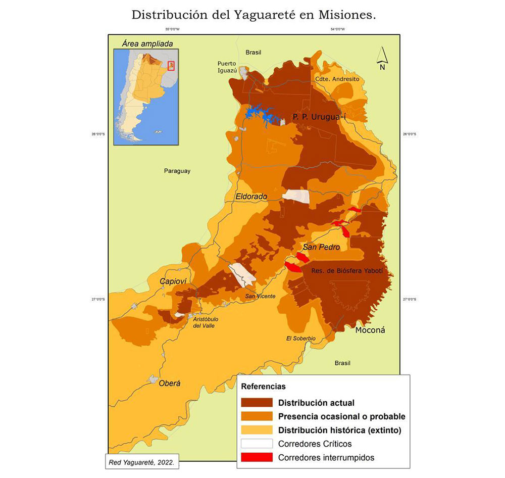 Finalmente, la Reserva de Biósfera Yabotí y zonas circundantes, con cerca de 270.000 hectáreas, ya está aislada ambientalmente del resto y hay que “volver a unirla”, conformada mayormente de propiedades forestales pero con núcleos fuertes como los Parques Provinciales Esmeralda y Moconá, resguardan a los ejemplares más australes del mundo, individuos que suelen cruzar el gran Río Uruguay hasta el Parque Estadual Do Turvo, en Brasil.