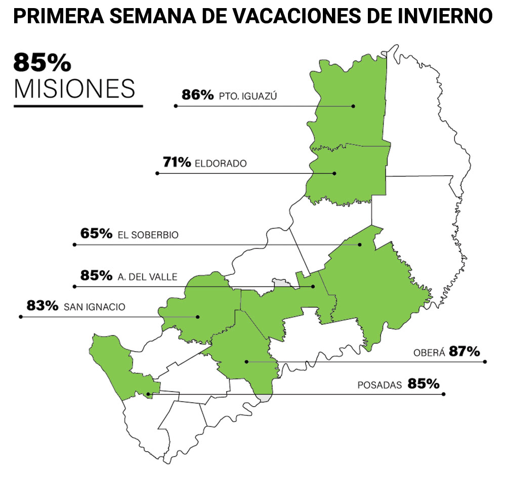 En cuanto a la ocupación, se registraron por ejemplo en Oberá 87%, Puerto Iguazú 86%, Aristóbulo del Valle 85%, San Ignacio 83%, El Soberbio 65% y Eldorado 71%.