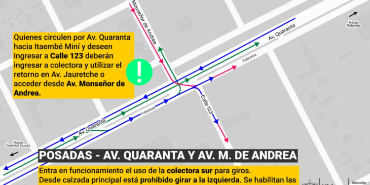Por ello, la Dirección Provincial de Vialidad (DPV) informó que a partir de mañana miércoles el giro se realizará siempre por calle colectora en la intersección mencionada, por lo que desde ese momento quedará prohibido el giro a la izquierda desde calzada principal.