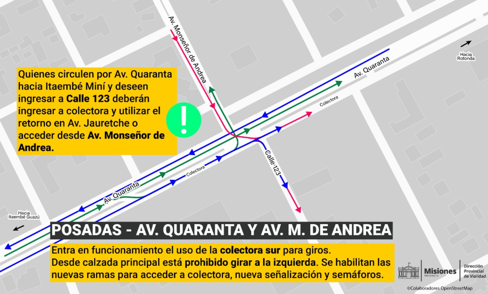 Asimismo, Vialidad informó que “quienes circulen de Oeste a Este -en dirección a la Rotonda- deberán tomar la rama de salida a colectora y esperar a que el semáforo les permita el giro a la izquierda. Quienes lo hagan en sentido opuesto, no pueden girar a la izquierda, razón por cual deberán ingresar a la colectora, conducir hasta intersección con avenida Jauretche, trasponer la calzada principal de la ruta nacional 12 e ingresar a la colectora para poder girar hacia calle 123″, explicó.