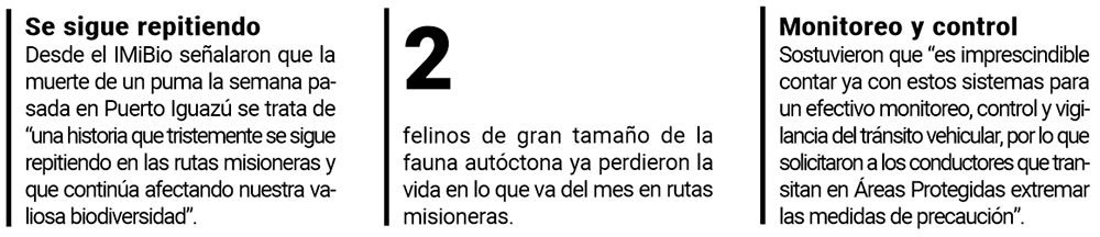 Al intentar traspasar la ruta un puma macho de aproximadamente 50 kilogramos de peso perdió la vida cuando fue atropellado por un vehículo, cuyo conductor se dio a la fuga y aún no fue identificado. “Una historia que tristemente se sigue repitiendo en las rutas misioneras y que continúa afectando nuestra valiosa biodiversidad”, manifestaron desde el IMiBio.