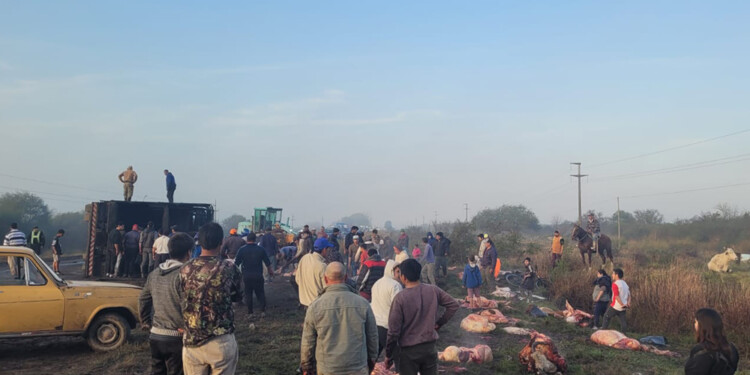 Al advertir el vuelco del camión que transportaba el ganado, vecinos de la zona se acercaron hasta el lugar para carnear los animales muertos. Un nutrido grupo de personas se llevó cortes de carne mientras se realizaban maniobras para remover el rodado siniestrado.