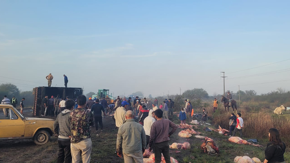 Al advertir el vuelco del camión que transportaba el ganado, vecinos de la zona se acercaron hasta el lugar para carnear los animales muertos. Un nutrido grupo de personas se llevó cortes de carne mientras se realizaban maniobras para remover el rodado siniestrado.