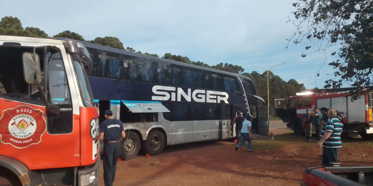 Esta tarde un principio de incendio en un colectivo Singer causó temor entre los pasajeros. El transporte circulaba sobre la Ruta Nacional N° 12 a la altura del kilómetro 1.530, más precisamente cerca del acceso a la localidad de Puerto Piray, cuando los choferes advirtieron que comenzó a salir humo debajo de los asientos ubicados en la parte superior.