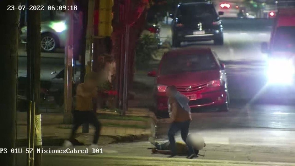 Este sábado alrededor de las 6 de la mañana los operadores del sistema de videovigilancia del 911 observaron el feroz ataque que estaba sufriendo un joven en avenida Cabred casi López Torres de la ciudad de Posadas por parte de dos sujetos.