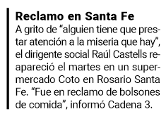 En plena crisis económica, el dirigente social Raúl Castells sostuvo que la situación social es compleja y alertó la posibilidad de la existencia saqueos en el país. El martes pasado, se hizo viral un video en el que se lo vio protagonizar un intento de toma en un supermercados de Rosario al reclamarle al Gobierno que haga entrega de bolsones de comida destinados a comedores.