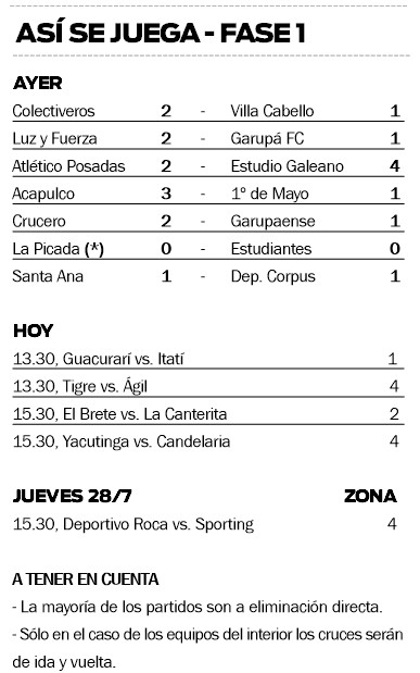 Finalmente, en Santa Ana, el dueño de casa y Deportivo Corpus igualaron 1-1. En este último caso no hubo definición por penales, ya que se pautó en el reglamento que habrá una excepción en esta zona de equipos del interior. Según pudo averiguar este Diario, este grupo será el único que tendrá partidos de ida y vuelta y no un solo partido eliminatorio.