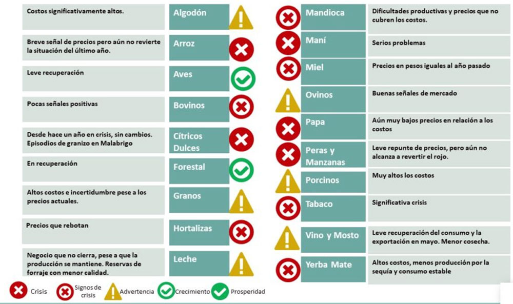 Este conjunto de factores impide que las producciones regionales aprovechen los buenos precios que se pagan por varios de sus productos, por los problemas derivados de las restricciones a las importaciones impuestas por el Gobierno nacional. A ello se suma la falta de mano de obra o el impacto de la sequía que afectó a varias zonas productivas. En ese contexto y de acuerdo con el semáforo de las producciones de Coninagro, la lechería, la producción de mandioca, de yerba mate y la industria forestal se ven afectadas de distinta manera por estas situaciones.