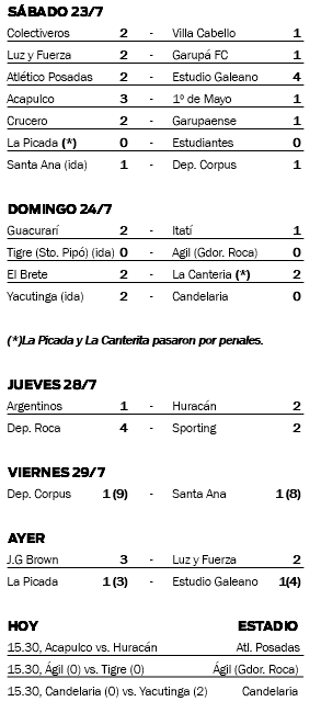 La acción continuará hoy con otros tres partidos. En cancha de Atlético Posadas, Acapulco que viene de eliminar a 1º de Mayo, enfrentará a Huracán; mientras que en Gobernador Roca, Ágil y Tigre de Santo Pipó jugarán la revancha de la Fase 1, tras el 0-0 de la ida. Por esa misma instancia, Candelaria recibirá a Yacutinga, que tiene un pie en la siguiente rueda luego del 2-0 del primer choque. Ambos se jugarán a las 15.30.