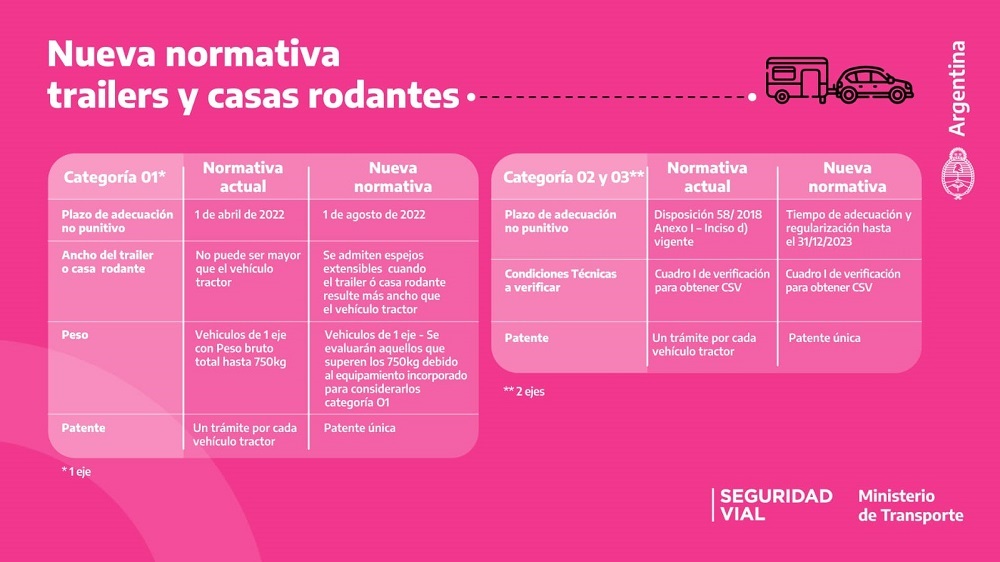 Luego de varias prórrogas e incluso de manifestaciones por parte de los propietarios en varias oportunidades, a partir de hoy 1 de agosto comienza a regir la nueva normativa sobre tráileres y casas rodantes, que tiene como objetivo determinar las características técnicas que deben reunir este tipo de vehículos para garantizar las condiciones de seguridad para su conducción segura dentro del territorio nacional, como, por ejemplo, guardabarros, paragolpes trasero, estabilidad y luces reglamentarias, entre otras.
