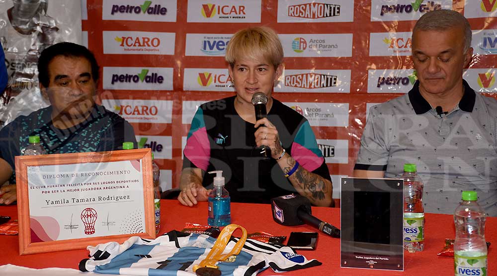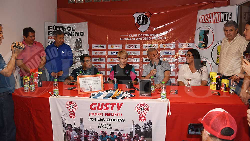 Junto a ella, en la mesa también estuvieron el vicegobernador Carlos Arce, el diputado Martín Cesino, el presidente de la Liga Posadeña de Fútbol Nelson Castelli, la presidenta del Departamento de Fútbol Femenino Mirta Parayva y Héctor “Chino” Torres, formador de Yamila, entre otros.