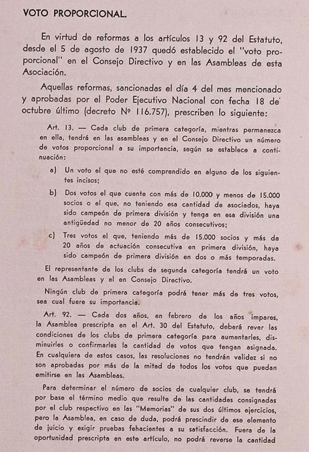 El boletín 286 del 4 de agosto de 1937 establecía en su “Artículo 13 –aprobada por 17 votos– que cada club de Primera, mientras permanezca en ella, tendrá en las Asambleas y en el Consejo Directivo un número de votos proporcional a su importancia, según se establece: a) Un voto para el que no esté comprendido en alguna de los siguientes incisos; b) dos votos para el que cuente con más de 10.000 y menos de 15.000 socios o el que, no teniendo esa cantidad de asociados, haya sido campeón de primera división y tenga en esa división una antigüedad no menor a 20 años consecutivos; c) tres votos para el que, teniendo más de 15.000 socios y más de 20 años de actuación consecutiva en primera división, haya sido campeón de primera división en dos o más temporadas”.