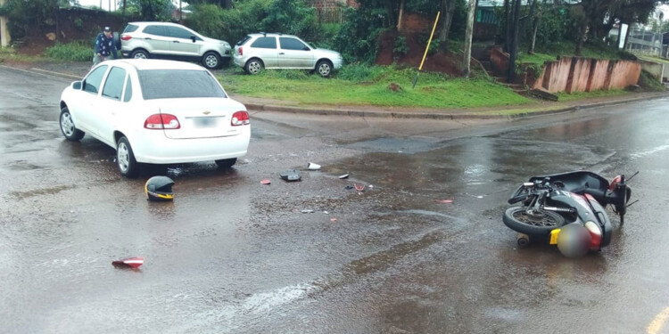 Este mediodía una moto y un auto protagonizaron un siniestro vial en la intersección de la avenida Cocomarola y la calle Cabrera de Posadas, en el que el conductor del rodado menor resultó herido.