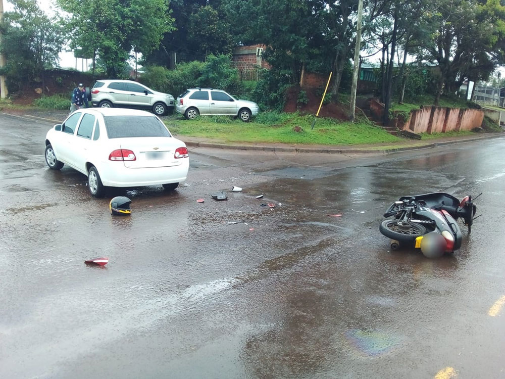 Este mediodía una moto y un auto protagonizaron un siniestro vial en la intersección de la avenida Cocomarola y la calle Cabrera de Posadas, en el que el conductor del rodado menor resultó herido.